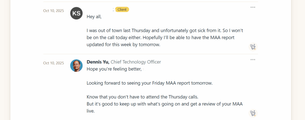 Ops reaches out directly. We check if there’s a clarity issue, access problem, or something blocking progress. We schedule a sync call to realign on expectations, priorities, and next steps.