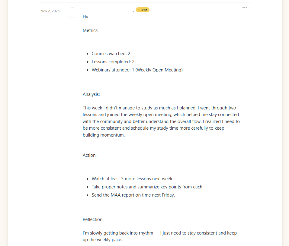 Every apprentice submits a weekly MAA (Metrics, Analysis, Action) report. This isn’t optional homework. It’s the engine that drives your progress and lets us coach you effectively.