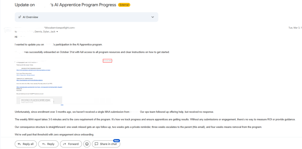If you’re a business owner who enrolled a young adult in our program: this is how we hold them accountable and how we support them. If your apprentice has gone quiet, know that we’re already following up. But your involvement matters. Ask them about their weekly MAA.