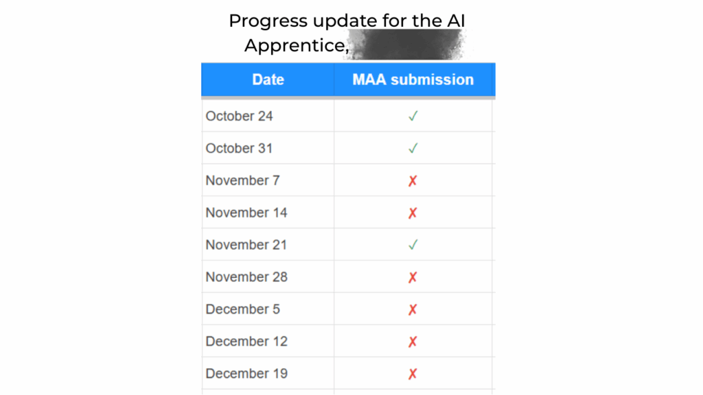 If you’re an AI Apprentice reading this: you already know what to do. Submit your MAA every Friday. If you’re on vacation, submit Thursday. If it’s short, that’s fine. Just don’t disappear.