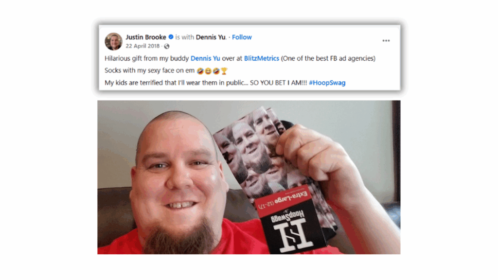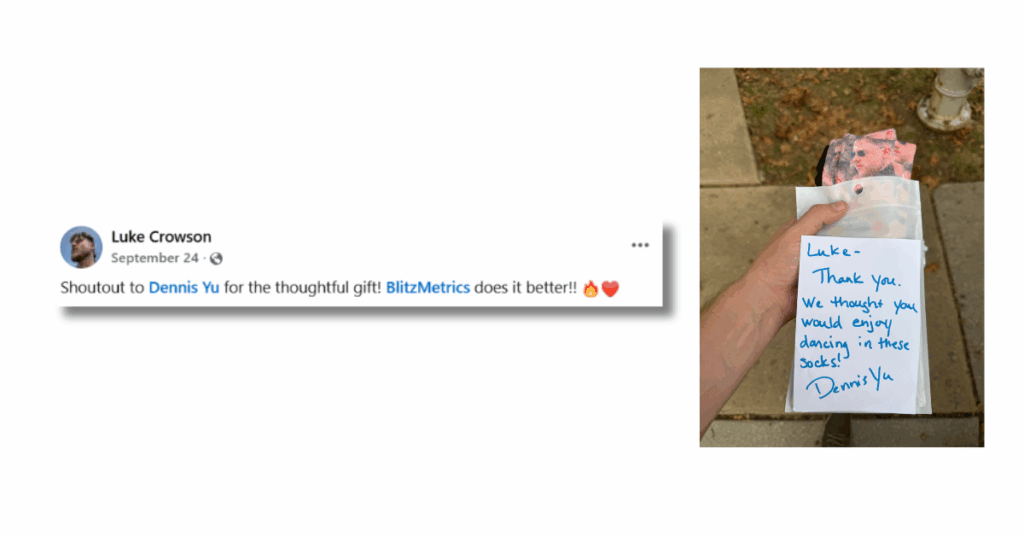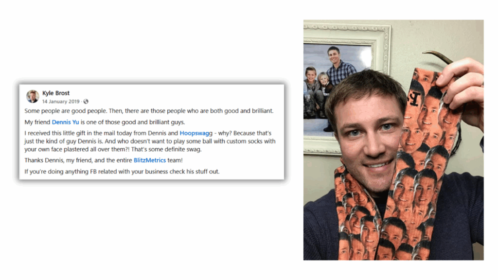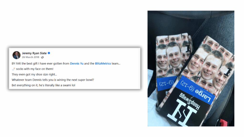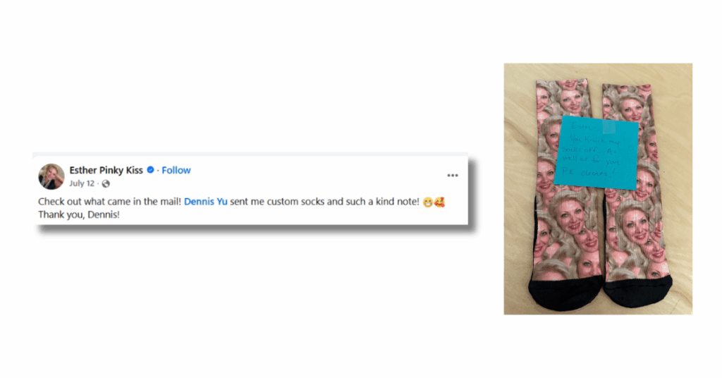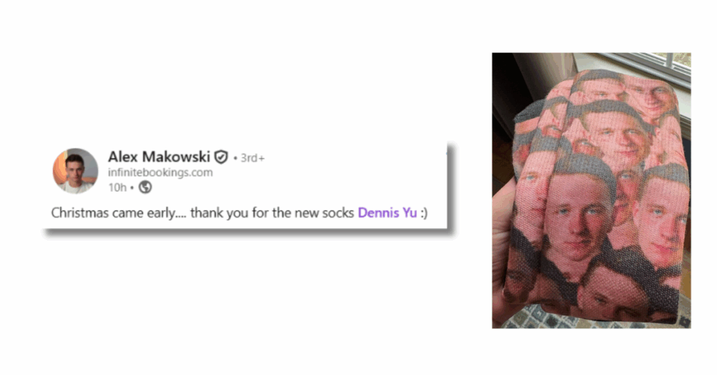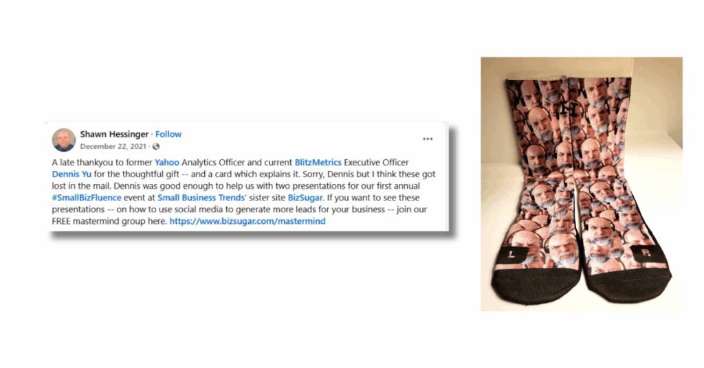 This is usually done by VAs for agency clients, conference organizers, podcast guests, and partners. But anyone can order socks for anyone. The point is to create a memorable experience that fuels relationships and content.