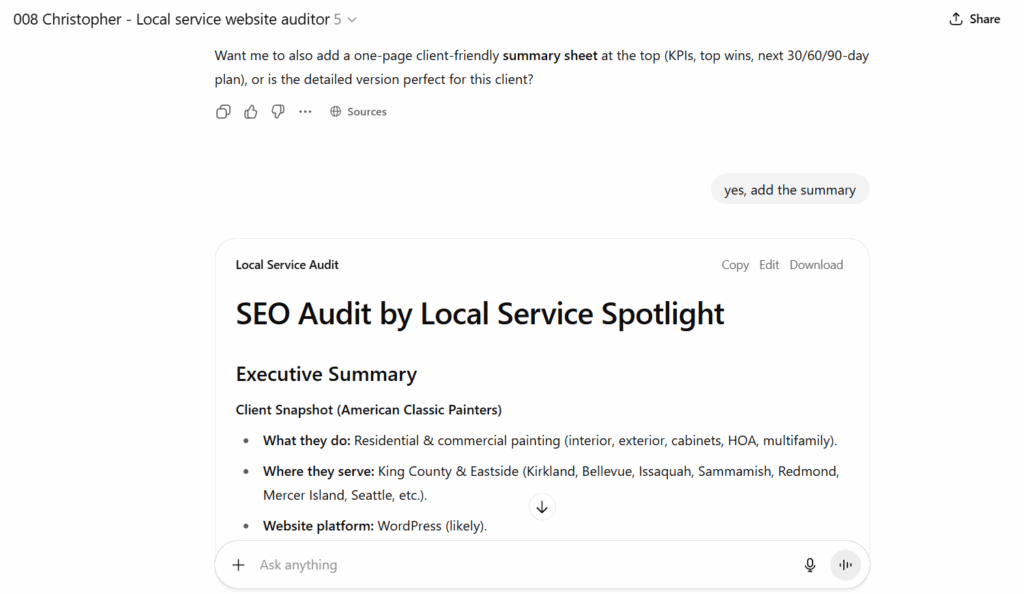 1. Capture business context: Company name, services, service area, top cities, website URL, mission, differentiators.