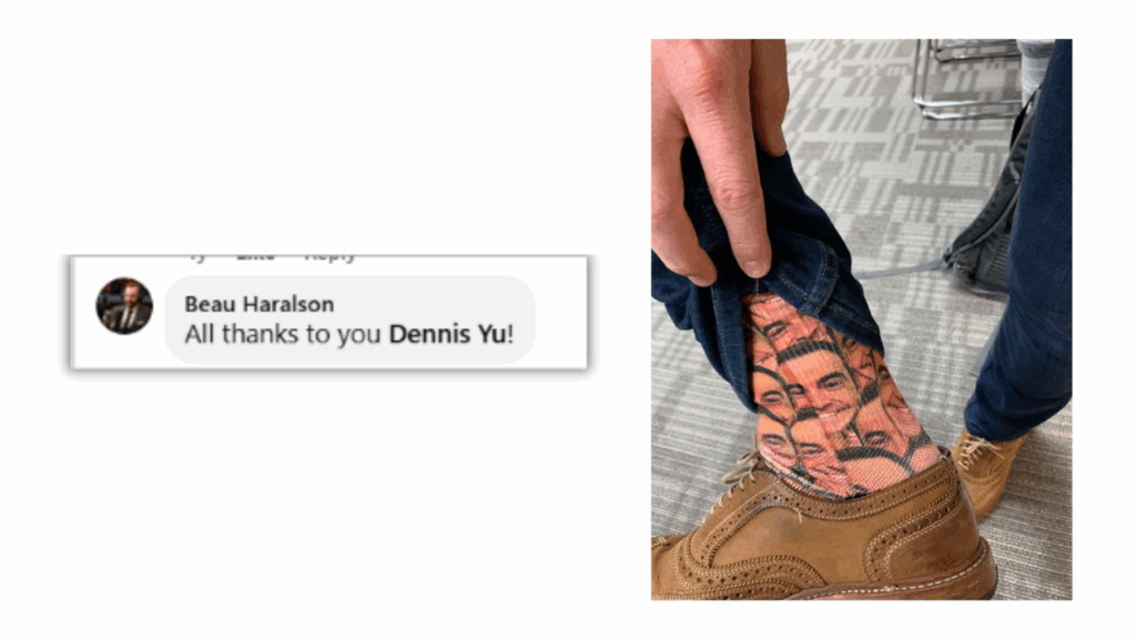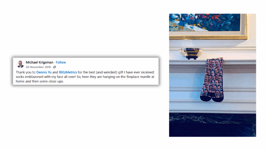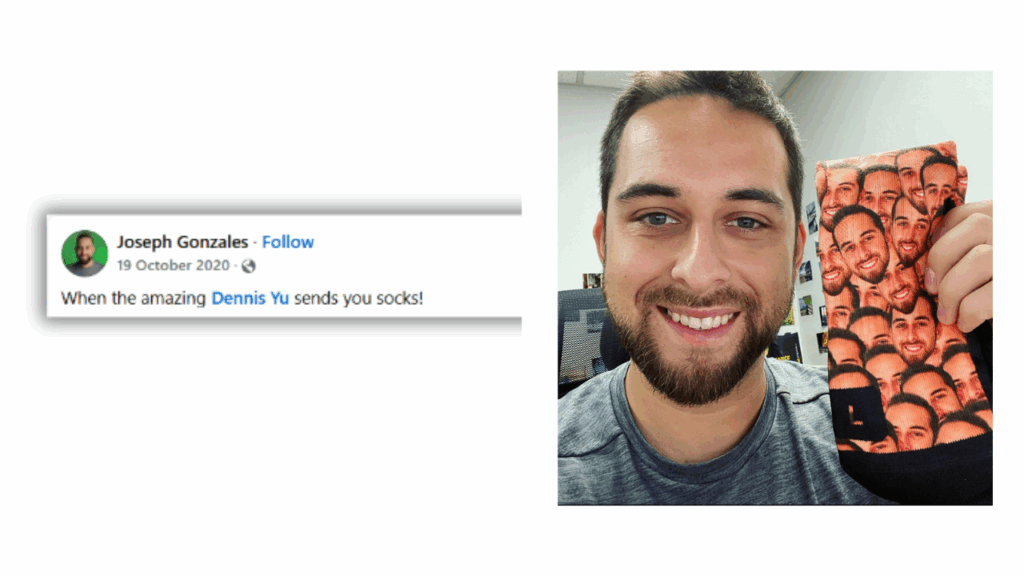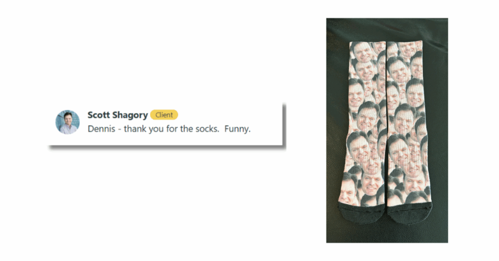 We love our friends and show it often. One of the ways we express gratitude is through personalized face socks; literally putting someone’s face on a pair of socks. It’s a playful, personal gift that fits into our Thank You Machine, which itself is a key part of the Content Factory process.