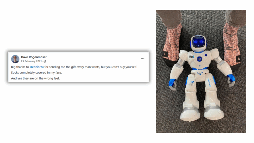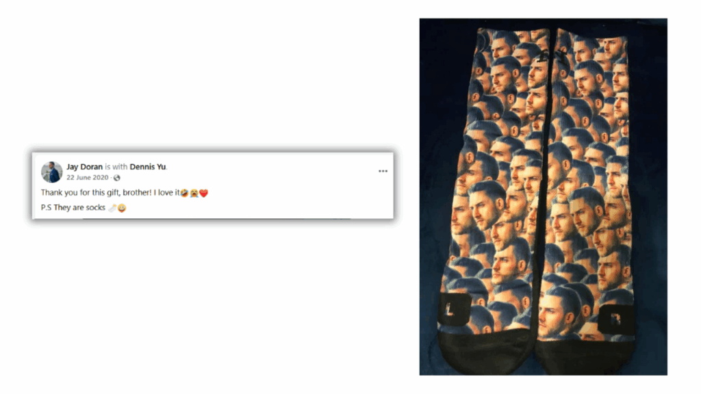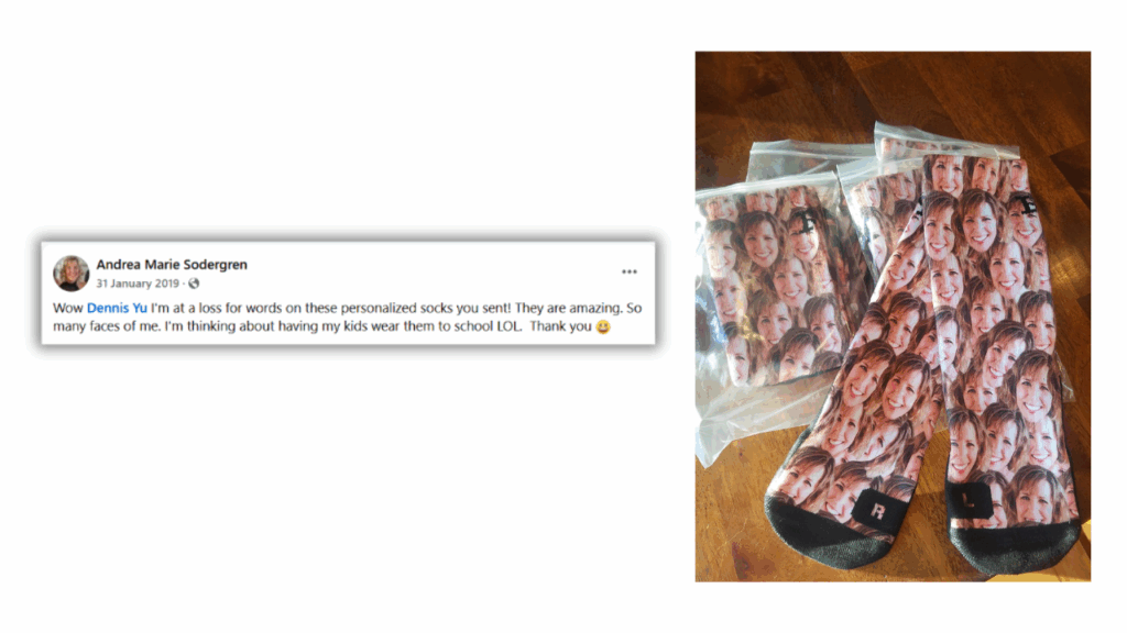 Imagine someone opening a package and finding their face printed on a pair of socks, along with a handwritten note that says something funny or thoughtful. They laugh, they post about it on social media, and they feel seen and appreciated.