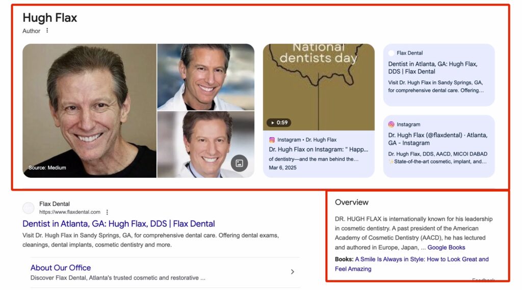 Here’s an example of Dr. Hugh Flax’s Knowledge Panel compared to his business listing (Flax Dental’s Google Business Profile / GBP).
